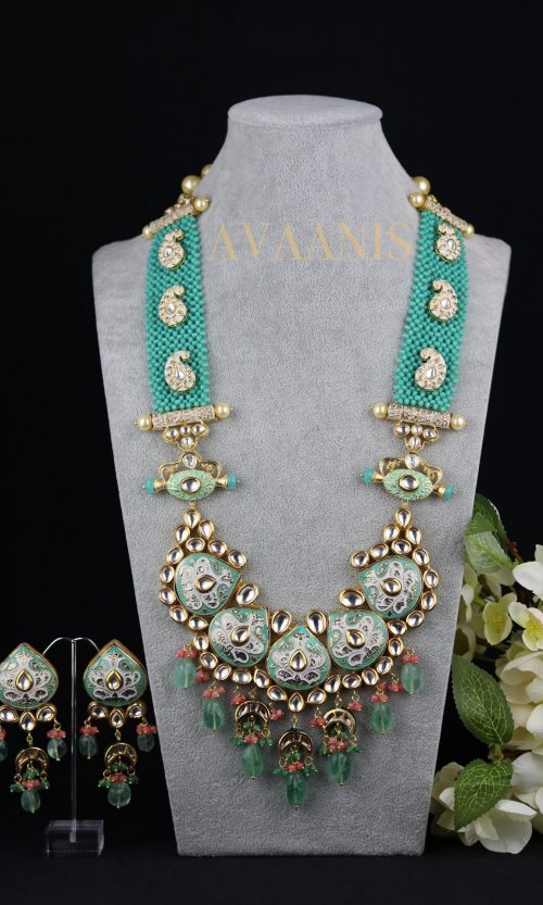 Kundan meenakari long pendant with salmon multi-strand beads and matching earrings.