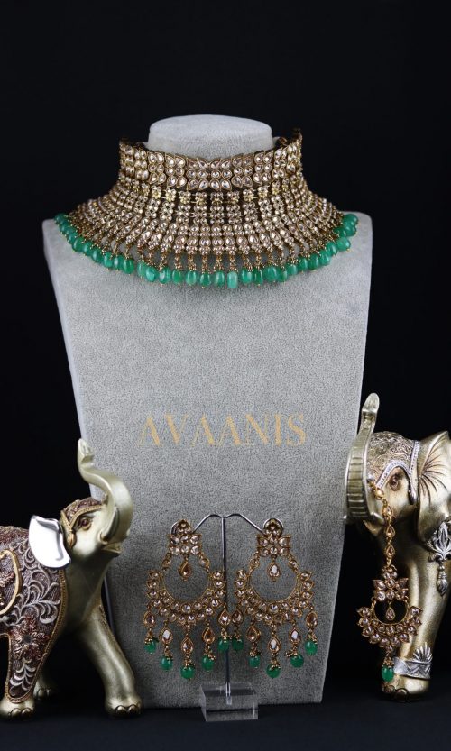 Kundan green and pink beads necklace set with matching earrings.